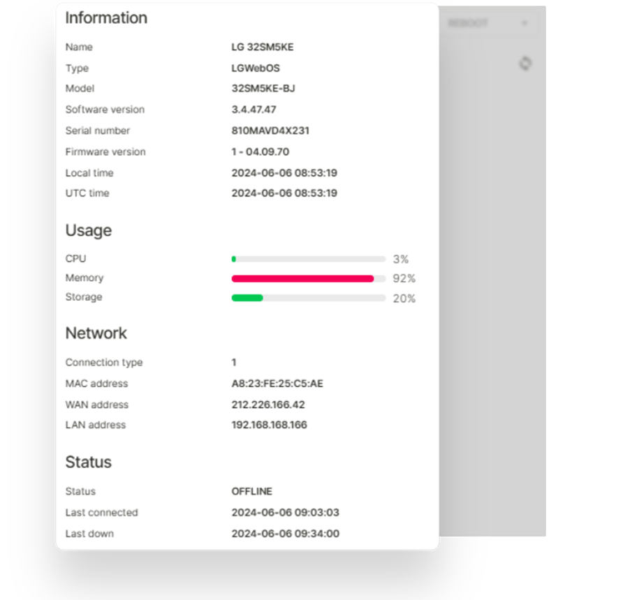 The layout has been reorganized into distinct sections—Information, Usage, Network, and Status—to enhance readability. Local time and UTC are now shown under the "Information" section for each device, ensuring greater clarity across time zones.